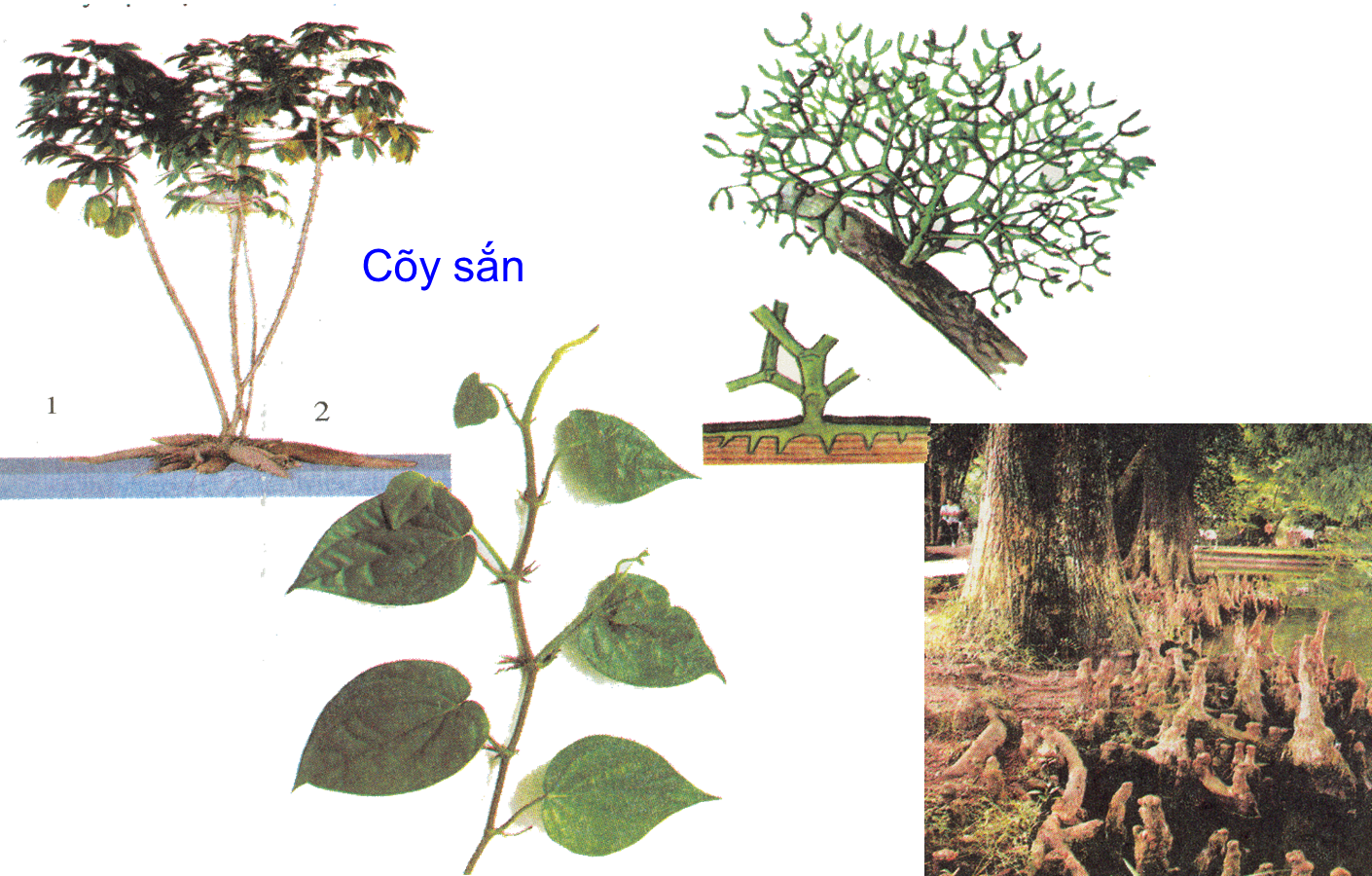 - Rễ thở: bụt mọc (Taxodium distichum), cây bần (Sonneratia),